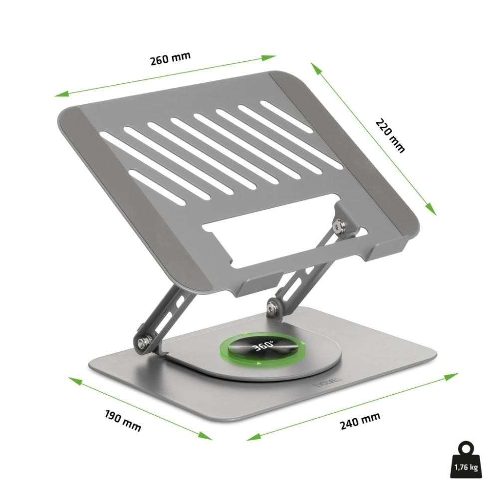 Podstavec unese zařízení až do hmotnosti 5 kg, takže zvládne běžné notebooky, výkonné herní mašiny i větší tablety. Plocha pro umístění vašeho zařízení má rozměry 26 × 21 cm.