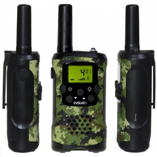 Dodávána s dobíjecími bateriemi, velký displej, dosah až 8 km v otevřeném prostoru, výkon 0.5 W, PMR 446 standard, VOX, CALL, Roger Beep, CTCSS, integrovaná LED svítilna, barva Army camouflage