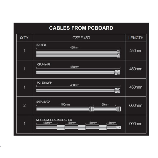 - 1x MOLEX, 450mm + MOLEX 150mm + MOLEX 150 mm + FDD 150 mm