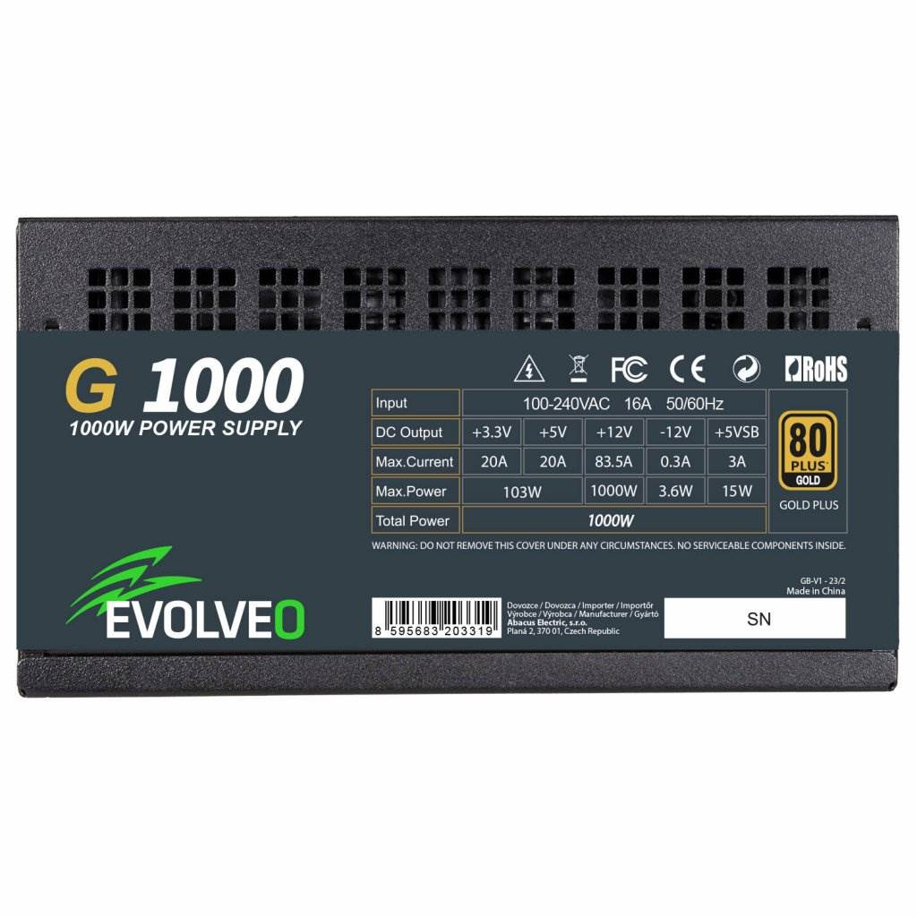 EVOLVEO G1000 PCIe 5.0, zdroj 1000W, ATX 3.0, 80+ GOLD, aPFC, 140mm ventilátor, retail, záruka 3 roky