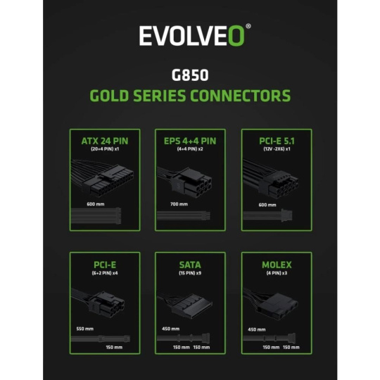 Zapomeňte na zamotané kabely, které brání proudění vzduchu a ještě vaší počítačové skříni kazí styl. Zdroj EVOLVEO G850-WH je plně modulární, takže k němu připojíte jen ty kabely, které opravdu potřebujete. Součástí balení jsou všechny důležité šňůry – jeden kabel ATX 24 PIN, dva EPS 4+4 PIN, dva PCI-E 6+2 PIN, jeden PCI-E 5.1 12V-2×6, tři SATA a jeden MOLEX. Díky tomu máte místo na vše od CPU a GPU přes disky až po vymazlené LED pásky či jiné extra prvky.