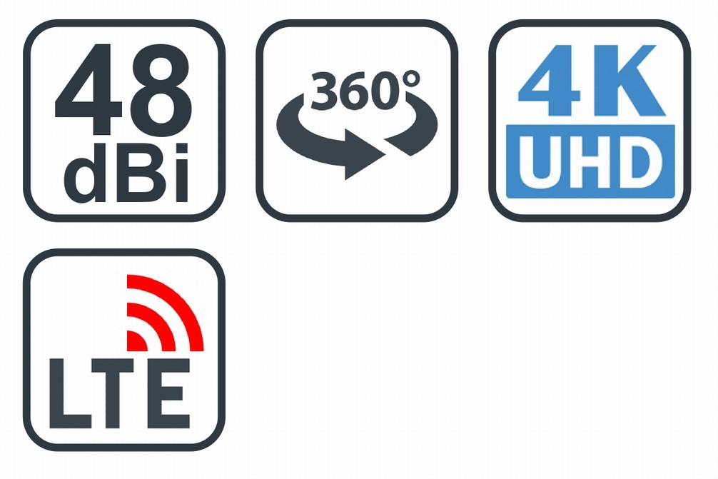 Nová větší verze populární venkovní antény s přijímacím úhlem 360° s kabelem 10m a redukcí IEC female/F male. Nová verze má průměr 380 mm.