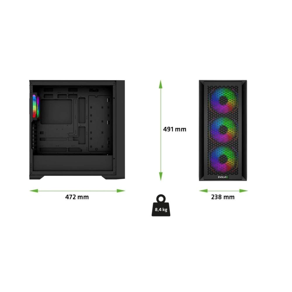 EVOLVEO Rhino, skříň eATX/ATX, 4x ARGB ventilátor 120mm, boční panel temperované sklo + mřížkovaný přední panel