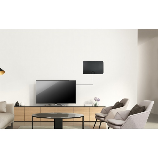 Elegantní pokojová anténa pro příjem digitální i analogové TV. Zesilovač antény lze napájet díky USB kabelu dvěma způsoby. Napájení pomocí adaptéru 230V a dále napájení z USB konektoru. Druhý způsob ocení uživatel, který chce sledovat TV např. na NB pomocí USB tuneru. Anténu lze přilepit sadou 3M oboustranných pásek na zeď, nábytek, nebo umístit do podstavce.