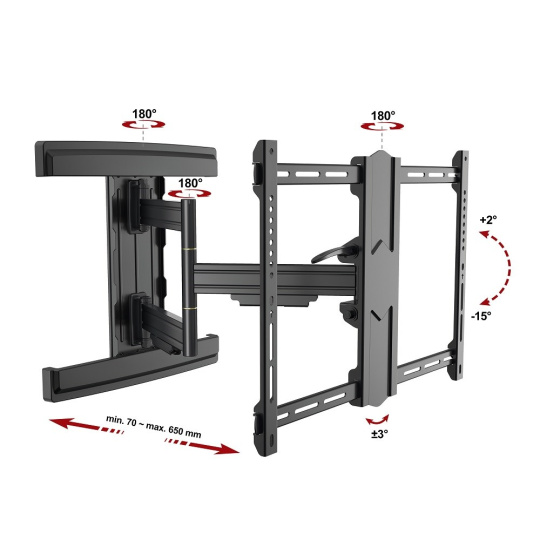 Excelentní držák na televizi Fiber Novelty Norton Nástěnný držák Tv 43"-80" excelentní provedení, vzdálenost od zdi 70-650mm, otočný +/-90°, náklon +2°/-15°, VESA 200x100 až 600x400, nosnost 50kg Záleží Vám jak na kvalitě, tak i designu a v neposlední řadě i na rozumné ceně? Držák Fiber Novelty Norton splňuje všechny tyto požadavky. Nástěnný polohovatelný držák pro zavěšení televizorů s úhlopříčkami 43" až 80" a naprosto bezpečnou nosností 50kg (držák byl testován při zatížení 120kg). Plné nastavení pozice televizoru s možností každodenní změny polohy - otáčení do stran, naklápění, nastavení vzdálenosti od zdi, korekce roviny. Vše v naprosto úžasném designu, který ocení určitě každý. Na držák je poskytnuta záruka 3 roky. Držák QLED OLED LED LCD plazma Tv v excelentním provedení - Fiber Novelty Norton Technické údaje: nosnost 50kg na televizory a monitory s úhlopříčkou 43" až 80" na všechny typy a značky televizorů, které podporují VESA standardy podporuje VESA standardy v rozmezí 200x100 až 600x400 nastavitelná vzdálenost od zdi v rozmezí 70mm až 650mm otáčení Tv do stran +/- 90° náklon Tv v rozmezí +2° až -15° korekce roviny obrazovky +/- 3° krásný moderní design profesionální konstrukce, naprostá bezpečnost a spolehlivost precizní provedení s důrazem na detail krytky na kabeláž a na nástěnný úchyt dodáván včetně instalačního materiálu barevné provedení černé záruka 5 let Držák na televize a monitory Fiber Novelty Norton Podporované VESA standardy pro zavěšení televizorů: VESA 200x100 VESA 200x200 VESA 300x100 VESA 300x200 a 200x300 VESA 300x300 VESA 400x200 a 200x400 VESA 400x300 a 300x400 VESA 400x400 VESA 500x300 VESA 600x400 všechny i nestandardní VESA rozměry v rozmezí 200x100 až 600x400 Precizní zpracování s důrazem na detail, krásné designové provedení a nejvyšší míra spolehlivosti a bezpečnosti - to jsou hlavní přednosti držáků Fiber Novelty Norton. Profesionální držák na televize Fiber Novelty Norton Držáky Fiber Novelty Norton jsou vhodné pro zavěšení všech dostupných typů televizorů i monitorů: zavěšení LED televizorů zavěšení LCD televizorů zavěšení OLED televizorů zavěšení QLED televizorů zavěšení prohnutých Curved televizorů zavěšení plazmových televizorů zavěšení LCD, LED monitorů zavěšení TFT monitorů zavěšení speciálních televizorů a monitorů zavěšení dotykových televizorů a monitorů.