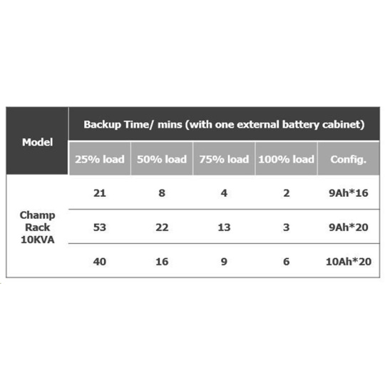 | Backup time - 1x Battery Bank (20pcs 10Ah) | |