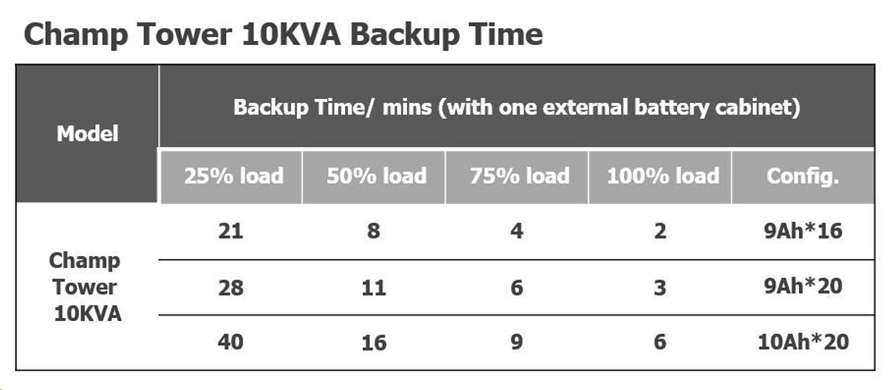 Backup time - 1x Battery Bank (20pcs 10Ah)