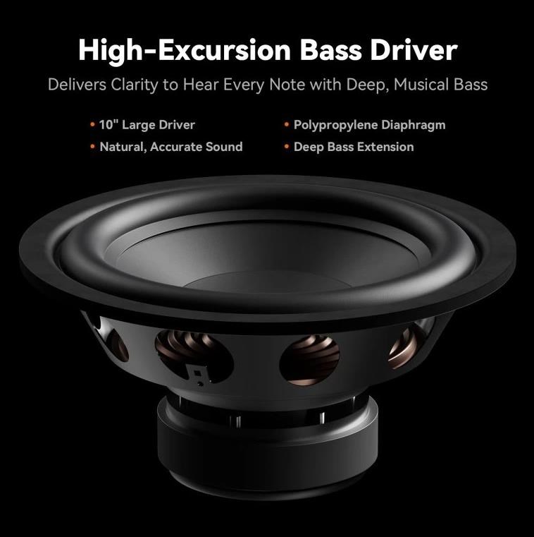 Aktivní subwoofer s 10" down-firing basovým reproduktorem, 200W Class-D zesilovač (špičkově až 500 W). Dvojité zadní bass-reflex porty, tuhá 14kg konstrukce. Vstupy: RCA a LFE. RCA výstup pro propojení dalšího subwooferu, nastavitelná fáze 0°–180°, crossover 40–180 Hz, dva DSP EQ režimy. Rozměry 36 × 36 × 40 cm. Součást balení: napájecí kabel 1,8 m, uživatelský manuál..
