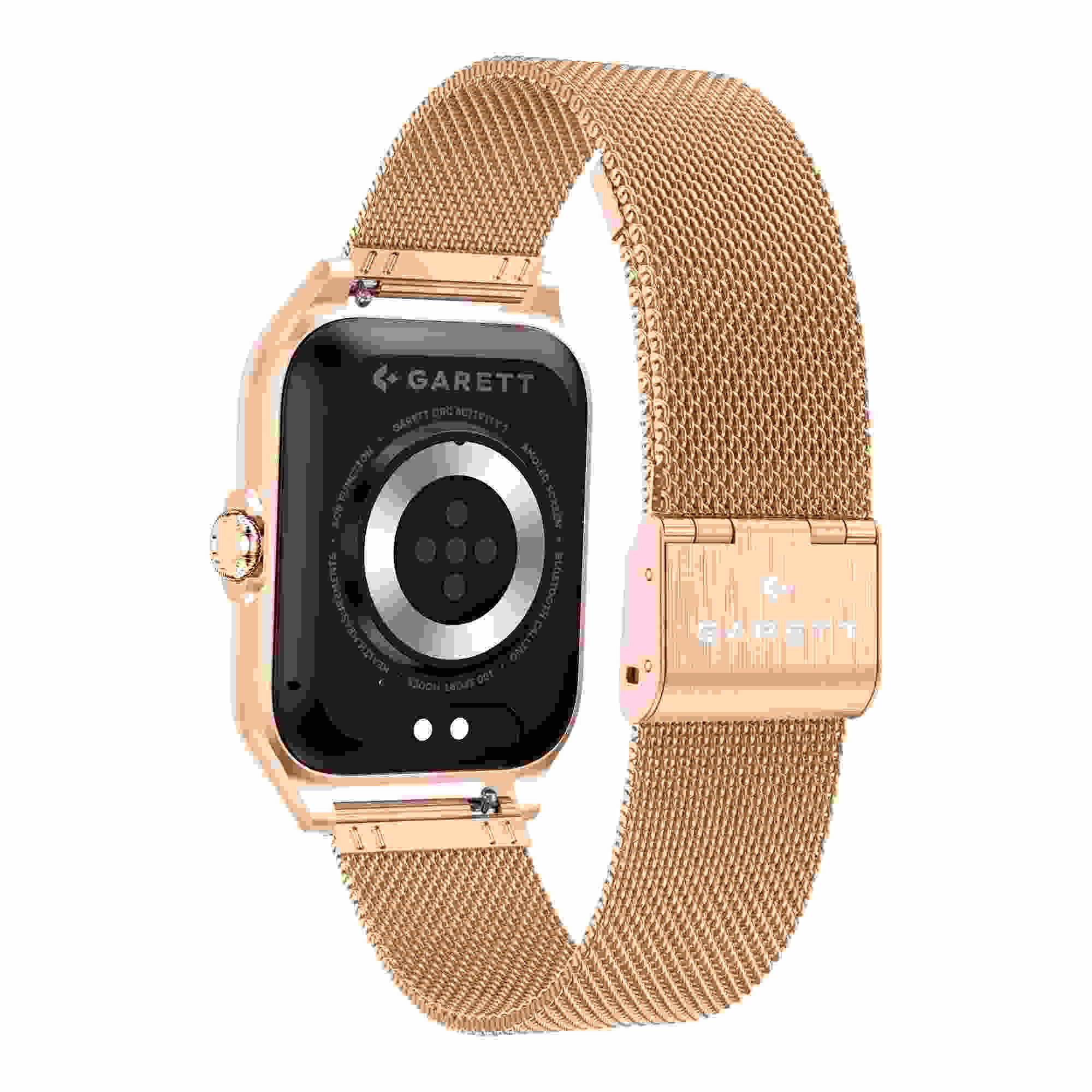 - Sada obsahuje: chytré hodinky Garett, zlatorůžový silikonový řemínek, zlatý kovový řemínek, nabíjecí kabel USB (bez zástrčky), příručku QSG