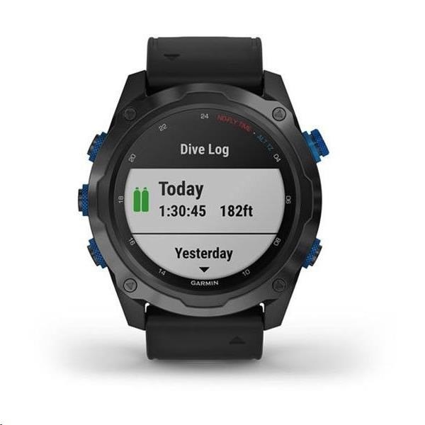 Potápěčský počítač se sonarovou technologií SubWave a s funkcemi chytrých a sportovně všestranných GPS hodinek, s mapami, MP3 hudbou a bezkontaktními platbami Garmin Pay. Safírové sklo, titanová luneta s DLC povrchovou úpravou, silikonový řemínek