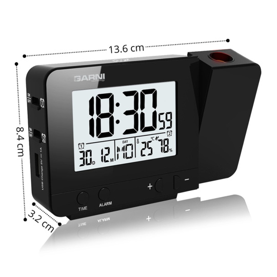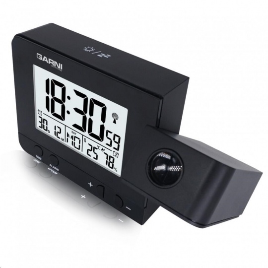 Digitální budík s projekcí času a vnitřní teploty s LCD displejem, časem řízeným rádiovým signálem DCF-77 a měřením vnitřní teploty a relativní vlhkosti LCD displej o rozměrech 63 x 42 mm s možností stálého osvětlení při napájení síťovým adaptérem, nebo krátkodobým osvětlením na 8 s při napájení bateriemi 3 stupně jasu osvětlení displeje, možnost vypnutí osvětlení displeje (při napájení síťovým adaptérem) velikost číslic na displeji – čas 25 mm, datum, zkratka názvu dne, vnitřní teplota a rel. vlhkost 8,5 mm čas a datum řízené signálem DCF-77 s možností manuálního nastavení ikona příjmu signálu DCF-77 zkratka názvu dne 12ti, nebo 24 hodinový formát zobrazení času možnost nastavení časového pásma od -12 do +12 hodin budík s 2 budícími časy s funkcí opakovaného buzení (Snooze) po 5 minutách budící signál - 10 sekund 1 pípnutí za sekundu, 10 sekund 2 pípnutí za sekundu, 10 sekund 4 pípnutí za sekundu a poté stálé pípání projekce času a vnitřní teploty s možností otočení obrazu o 180°, možnost sklopení tubusu projektoru o 90° dopředu a dozadu barva projekce červená stálá projekce při napájení síťovým adaptérem s možností vypnutí zobrazení hodnot vnitřní teploty a relativní vlhkosti zobrazení teploty ve °C, nebo °F USB port pro nabíjení mobilních zařízení (pouze při napájení hlavní jednotky síťovým adaptérem), maximální nabíjecí proud 1 000 mA napájení síťovým adaptérem, nebo bateriemi možnost postavení barva černá Obsah balení: 1 x digitální budík GARNI 140 1 x síťový adaptér český, slovenský, německý, anglický, italský, polský a maďarský návod.