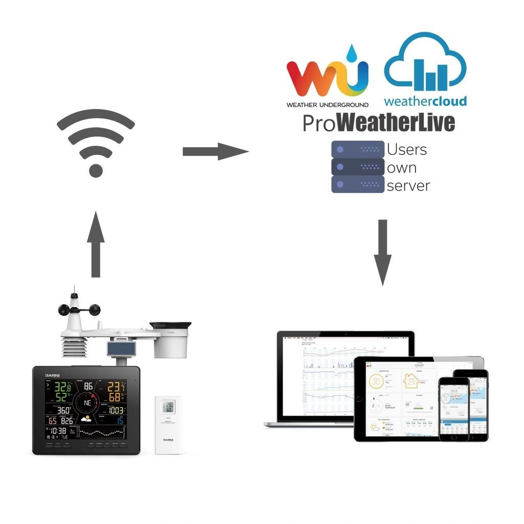 • přenos dat naměřených hlavní jednotkou a integrovaným čidlem 7-v-1 na server ProWeatherLive (PWL), Weather Underground, Weathercloud nebo vlastní server uživatele. Přenos dat je možný na všechny servery současně. Pro zobrazení předpovědi počasí je nutné připojení k serveru ProWeatherLive.