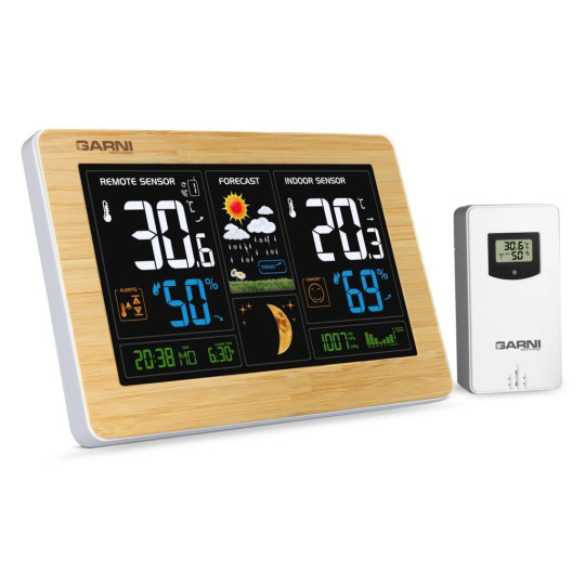 ? inverzní barevný VA displej o rozměrech 167 x 93 mm s možností stálého osvětlení při napájení síťovým adaptérem, nebo krátkodobým osvětlením na 15 s při napájení bateriemi ? ? velikost číslic na displeji – čas, datum, barometrický tlak 8 mm, zkratka názvu dne 6 mm, vnitřní a vnější teplota 30 mm, vnitřní a vnější relativní vlhkost 20 mm ? čas a datum řízené signálem DCF-77 s možností manuálního nastavení ? ikona příjmu signálu DCF-77 ? zkratka názvu dne ? 12ti, nebo 24 hodinový formát zobrazení času ? možnost nastavení časového pásma od -12 do +12 hodin ? ? budící signál - 10 sekund 1 pípnutí za sekundu, 10 sekund 2 pípnutí za sekundu, 10 sekund 4 pípnutí za sekundu a poté stále 8 pípnutí za sekundu ? 6 animovaných ikon předpovědi počasí (slunečno, polojasno, oblačno, srážky, silný déšť a sněžení) na základě sledování barometrického tlaku vestavěným barometrickým čidlem ? ? ? měření absolutního barometrického tlaku (mb / hPa nebo inHg) ? šipky tendence vývoje absolutního barometrického tlaku, vnitřní a vnější teploty a rel. vlhkosti ? ? zobrazení teploty ve C, nebo F ? možnost použití až 3 bezdrátových čidel GARNI 30H (jedno čidlo GARNI 030H je součástí dodávky) ? funkce automatického přepínání kanálů ? 5 ikon vnitřní tepelné pohody ? bezdrátový přenos hodnot vnější teploty a relativní vlhkosti na frekvenci 433 MHz ? ikona příjmu signálu bezdrátového čidla ? zobrazení fáze Měsíce ? USB port pro nabíjení mobilních zařízení (pouze při napájení hlavní jednotky síťovým adaptérem), maximální nabíjecí proud 1 000 mA ? ikony slabých baterií ? napájení síťovým adaptérem nebo bateriemi ? možnost postavení, nebo zavěšení ? barva bílá, přední rámeček z bambusového dřeva Bezdrátové čidlo GARNI 030H ? vlhkosti odolné ? displej o rozměrech 19 x 11 mm ? velikost číslic na displeji: teplota a relativní vlhkost 4 mm ? měření teploty a relativní vlhkosti ? 3 kanály ? maximální RF výkon 10 dBm (10 mW) ? možnost postavení a zavěšení ? barva bílá Obsah balení: 1 x hlavní jednotka GARNI 547 Line 1 x bezdrátové čidlo GARNI 030H 1 x síťový adaptér český, slovenský, německý, anglický, nizozemský, polský a maďarský návod.