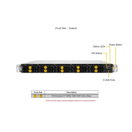 | Úložiště | 8 hot-swap 2.5" NVMe/SATA/SAS pozic, volitelně až 12 pozic s dalšími komponenty |