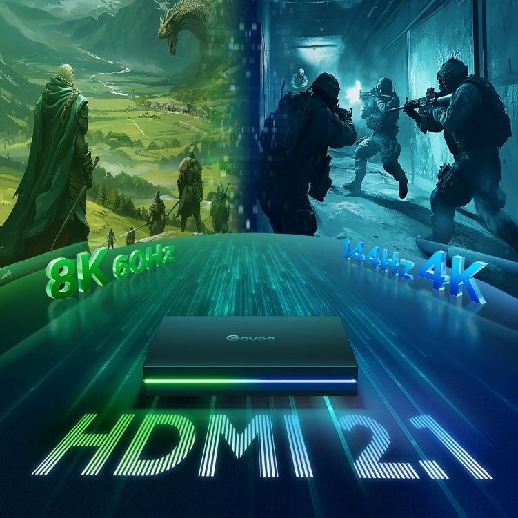Govee AI Sync Box Kit 2 je vybaven HDMI 2.1, což umožňuje podporu pokročilých funkcí, jako jsou Dolby Vision, ARR a ALLM. Díky této technologii můžete očekávat špičkovou kvalitu obrazu s bohatými barvami a vyšší dynamikou, ideální pro moderní domácí kino a herní sestavy. HDMI 2.1 zajišťuje optimální kompatibilitu s nejnovějšími standardy, což znamená plynulé přepínání režimů a minimální latenci pro dokonale synchronizovaný vizuální zážitek.