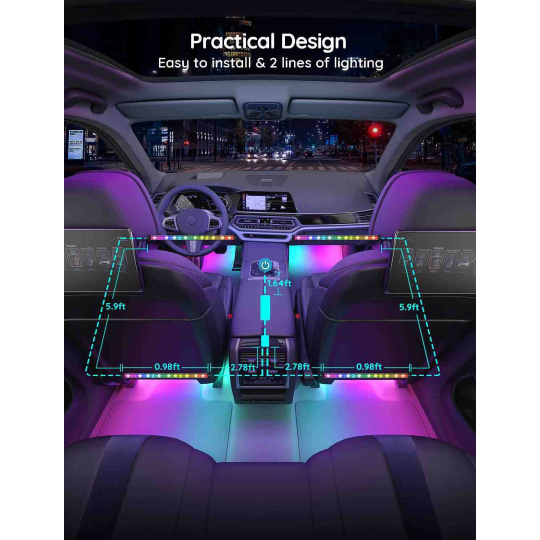 Úsporné interiérové chytré LED pásky Govee Smart RGBIC do auta s životností až 50.000 hodin vylepší interiér vašeho automobilu a poskytnou zážitek, který se naskytuje u luxusních vozů. Můžete je použít prakticky všude, kde je zapalovaní. Zobrazuje až 16 milionů barev, jejichž intenzitu lze nastavit od 1-100%. Díky technologii RGBIC si můžete rozdělit pásek na samostatné segmenty, pro které si můžete pak volit rozdílné barvy. Vyberte si ze 30 režimů osvětlení a při poslouchaní oblíbené hudby se budou světla synchronizovat. Nebo si prostě nastavte svoje vlastní barevné kombinace v režimu DIY. Příkazy můžete zadat přes aplikaci Govee Home na chytrém telefonu nebo tabletu nebo přímo na Control boxu. Instalace je jednoduchá a je rozdělená na přední a zadní část automobilu.