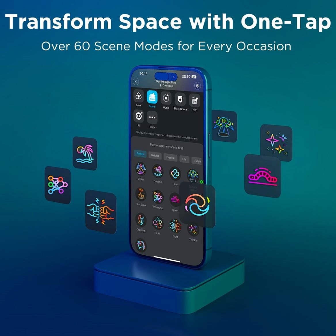 Panely nabízejí více než 60 unikátních světelných scén, které vám umožní přizpůsobit osvětlení přesně podle vaší nálady a stylu. Speciální vizuální efekty dokážou vytvořit dynamickou a poutavou atmosféru, a to nejen při hraní her, ale i sledování filmů nebo poslechu hudby. Díky funkci synchronizace s hudbou světla reagují v reálném čase na rytmus a zvuk, což přináší živý a interaktivní zážitek, který oživí každou místnost.