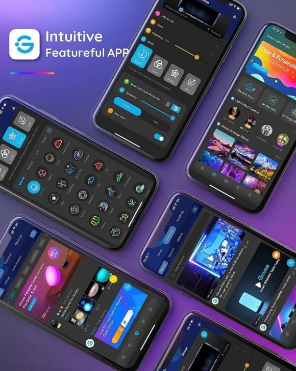 Spravujte nastavení barev a intenzity světla jednoduše pomocí aplikace Govee Home. Aplikace je zdarma ke stažení v Google Play a AppStore. Navíc získáte přístup k funkci časovače, DIY barvám, režimu videa, synchronizaci hudby a režimům scény.