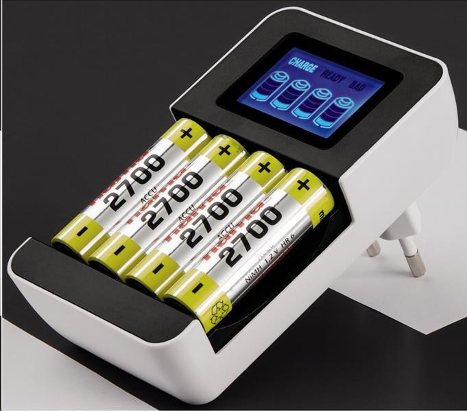- zásuvková nabíječka pro 1-4 NiMH akumulátory AA (mignon) nebo AAA (micro) - 4 individuální nabíjecí sloty, každý akumulátor je monitorován a nabíjen samostatně (možnost nabíjení akumulátorů různého typu a kapacity současně) - LCD displej s grafickým zobrazením průběhu nabíjení - nabíjení řízené mikroprocesorem (ochrana proti přebíjení a přehřátí akumulátorů) - automatické ukončení nabíjení pomocí detekce Delta-U - bezpečnostní časová pojistka - detekce vadných akumulátorů - ochrana proti nesprávné polaritě Technické parametry: - typ nabíječky: automatická - konstrukce nabíječky: zásuvková (integrovaná síťová vidlice) - typ akumulátorů: NiMH, velikost AA (R6) mignon/AAA (R03) micro - nabíjecí proud: 450 mA (AA)/200 mA (AAA) - napájení: 100-240 V/50 Hz - barva: černá/bílá.