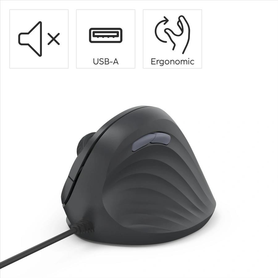 - moderní ergonomická kabelová myš pro pracování s počítačem bez bolesti - vertikální provedení předchází namožení a bolesti ramen a zápěstí - tichá, bez zvuků při klikání pro nerušenou práci - DPI tlačítko pro rychlou změnu rozlišení (DPI 1000/1400/1800) - aktivace AI asistenta v systému tlačítkem - tlačítka s funkcí zpět/vpřed v prohlížeči - pogumovaný povrch myši a kolečka - polymerové kluzné plochy - dlouhý kabel s připojením k USB-A nebo USB-C zásuvce (integrovaný adaptér) - tělo a tlačítka jsou vyrobena z 65% z recyklovaného ABS plastu - balení je 100% bez plastů Systémové požadavky: - běžné funkce: Windows 11/10, Mac OS 11 nebo novější - tlačítko Assist: Windows 11 s aplikací Microsoft Copilot Technické parametry: - připojení: USB-A vidlice, USB-C vidlice - počet tlačítek: 7 včetně rolovacího kolečka - rozlišení: 1000/1400/1800 DPI - délka kabelu: 1,8 m - rozměry: 8,6 x 11,5 x 7,1 cm - hmotnost: 110 g - barva: černá.