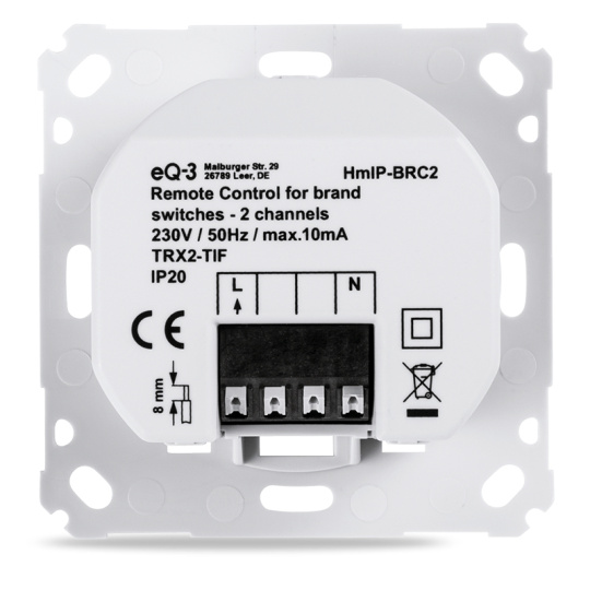 Akční člen dálkového ovládání (HmIP-BRC2) se montuje do standardní zápustné krabice pod omítku s připojením do sítě 230 V. Bezdrátová komunikace nabízí možnost instalace bez potřeby druhotné kabeláže. To znamená, že akční člen lze umístit v místě připraveného nebo stávajícího elektrického rozvodu sítě 230 V. Napájení pouze ze sítě 230 V.