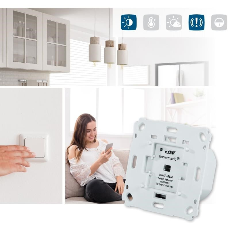 Programovatelný bezdrátový Spínací akční člen s měřením (HmIP-BSM) pro zápustnou montáž, napájený ze sítě 230 V, je součástí systému chytré domácnosti Homematic IP.