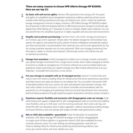 Žádné kompletní výměny: Díky programu HPE Timeless Storage pro HPE Alletra Storage MP B10000 můžete chránit své investice a udržovat úložiště neustále aktuální pomocí aktualizace řadiče bez přerušení provozu. Tím se sníží vaše celkové náklady na vlastnictví a ušetříte v průměru 30 % oproti tradičním kompletním výměnám. Neustále se zlepšující datové služby: Využijte plný potenciál HPE Alletra Storage MP B10000 s naším komplexním předplatným softwaru. Získejte přístup ke všem funkcím a vylepšením našeho operačního systému, včetně cloudových operací řízených umělou inteligencí v cloudu HPE GreenLake, bez dalších nákladů. Spolehněte se na 100% dostupnost dat – zaručeno: Zapomeňte na přerušení provozu způsobená neočekávanými výpadky. HPE Alletra Storage MP B10000 je platforma řízená umělou inteligencí, rozdělená a bez jediného bodu selhání, která zaručuje odolnou 100% dostupnost dat pro každého zákazníka a každé pole. Ukládejte více za méně s HPE StoreMore Guarantee: To zaručuje celkovou úsporu minimálně 4:1 pro vaše pracovní zatížení – snížení nákladů na fyzické úložiště, úsporu energie a zmenšení stopy datového centra. 30denní záruka spokojenosti: Vyzkoušejte HPE Alletra Storage MP B10000 po dobu 30 dnů bez rizika. Pokud nebudete zcela spokojeni s výhodami a schopnostmi vašeho úložného systému, jak jsou popsány v produktových specifikacích, budeme s vámi spolupracovat na nápravě.
