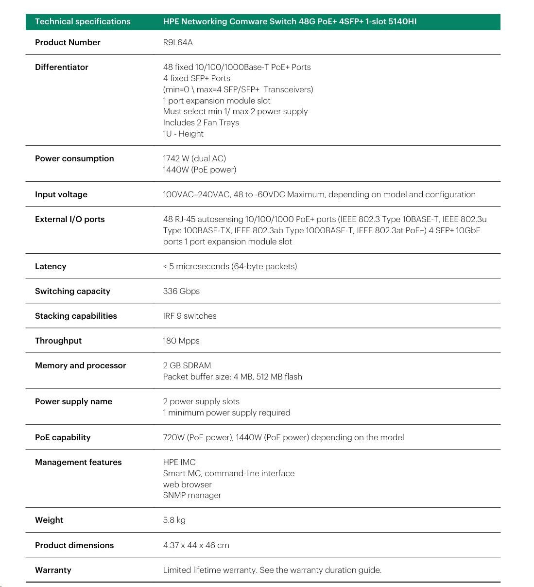 HPE FlexNetwork 5140 48G PoE+ 4SFP+ HI Switch R9L64A RENEW