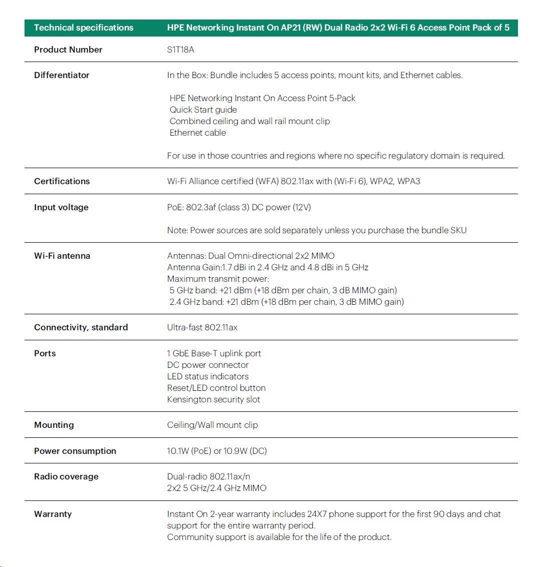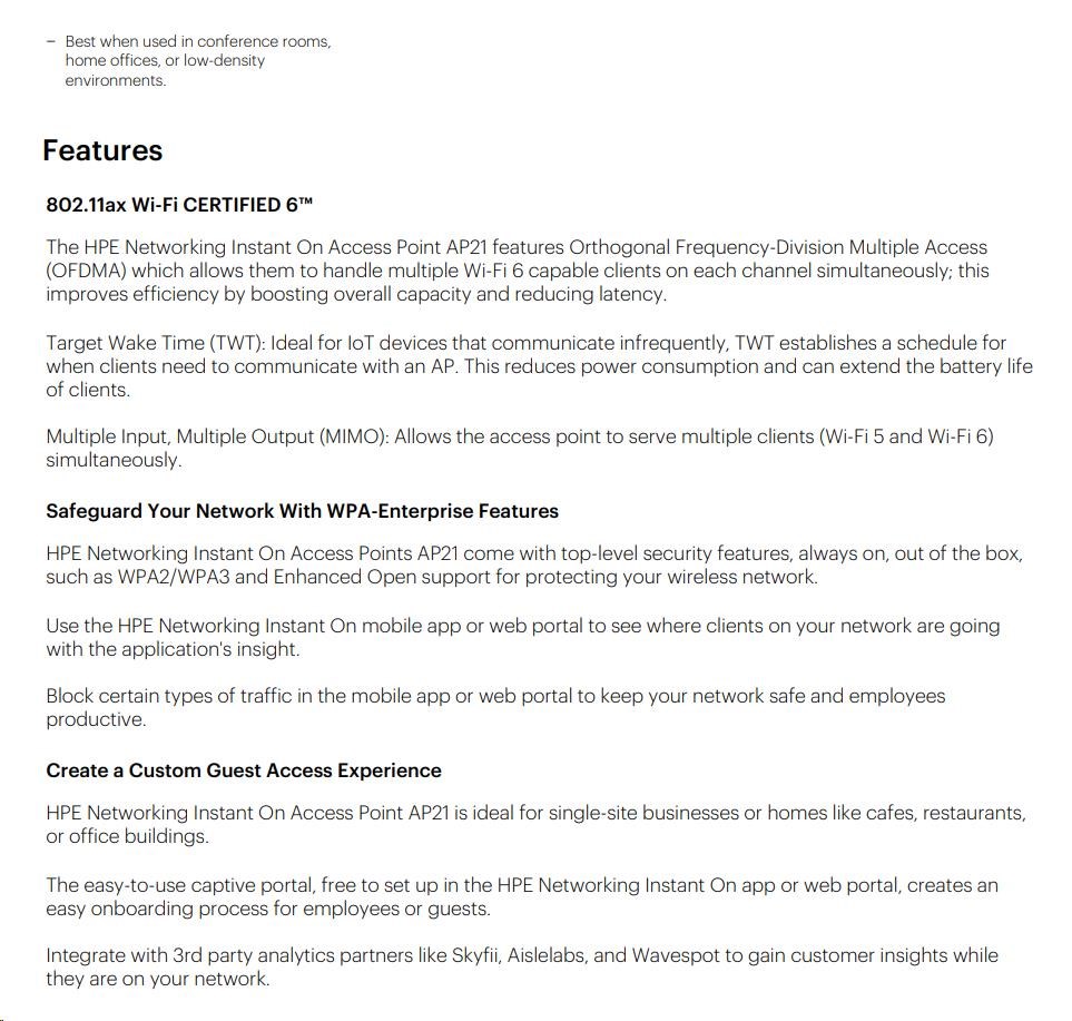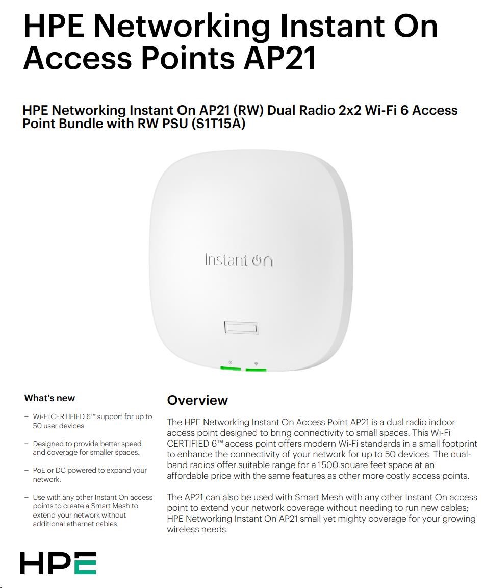 HPE Networking Instant On AP21 (RW) Dual Radio 2x2 Wi-Fi 6 Access Point 5 Pack (+ 5 Mount Brackets).