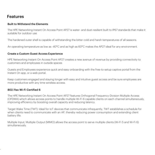 HPE Networking Instant On Access Point AP27 je dvoupásmový venkovní přístupový bod navržený tak, aby udržel vaše zaměstnance a zákazníky produktivní i venku. Tento přístupový bod s certifikací Wi-Fi CERTIFIED 6™ podporuje až 75 současně připojených uživatelů a nabízí moderní standardy Wi-Fi v robustním a odolném provedení. Tyto dvoupásmové všesměrové antény poskytují působivý dosah a stejné funkce jako jiné podnikové přístupové body, ale bez jakýchkoli průběžných poplatků za předplatné. AP27 je vybaven integrovanými držáky pro montáž na zeď nebo stožár v odolném krytu pro flexibilní instalace ve venkovních prostředích. AP27 nabízí napájení přes Ethernet (PoE) 802.3af (třída 4) s plně integrovanou správou prostřednictvím mobilní aplikace Instant On nebo webového portálu.