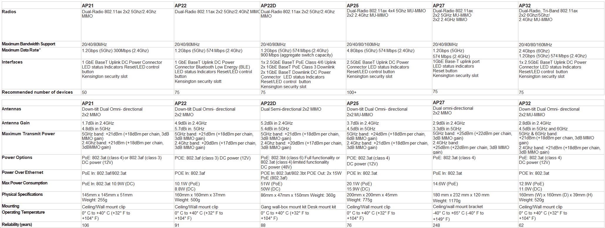 Interfaces | 1 GbE BaseT Uplink DC Power Connector LED status Indicators Reset/LED control button Kensington security slot | 1 GbE BaseT Uplink DC Power Connector Bluetooth Low Energy (BLE) LED status Indicators Reset/LED control button Kensington security slott | 1x 2.5GbE BaseT PoE Class 4/6 Uplink 2x 1GbE BaseT PoE Class 3 Downlink 2x 1GbE BaseT Downlink DC Power Connector LED status Indicators Reset/LED control button Kensington security slot | 2.5GbE BaseT Uplink DC Power Connector LED status Indicators Reset/LED control button Kensington security slot | 1GbE Base-T uplink port LED status indicators Reset button Kensington security slot | 1x 2.5GbE BaseT Uplink DC Power Connector LED status Indicators Reset/LED control button Kensington security slot |
