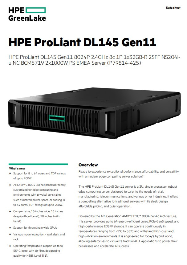 Server HPE ProLiant DL145 Gen11 je 2U, jednoprocesorový, robustní server edge computing navržený tak, aby vyhovoval potřebám maloobchodu, výroby, telekomunikací a různých dalších odvětví. Nabízí přesvědčivou alternativu k tradičním serverům s elegantním designem, dostupnou cenou a tichým provozem.