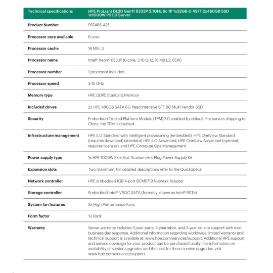 HPE PL DL20g11 6333P (3.1G/6C12T) 1x32G 2x480GB VROC 4SFF 1x1000W 4x1G NBD333 Smart Choice
