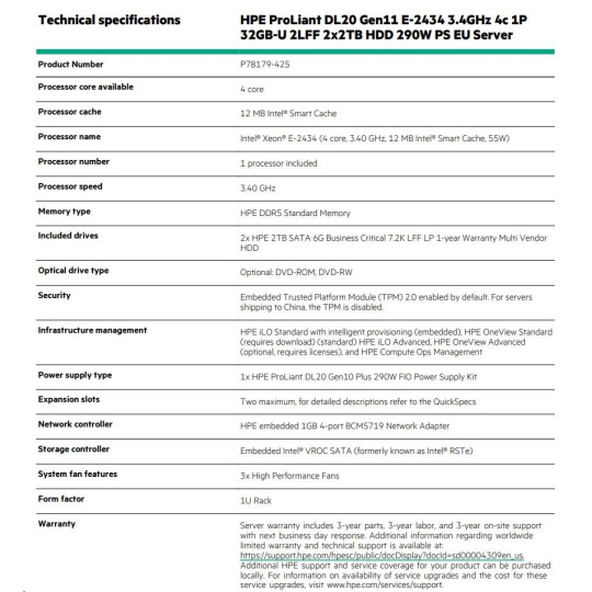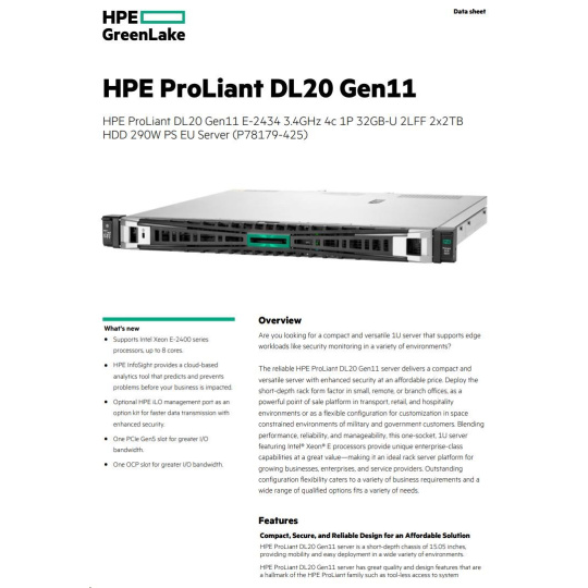 HPE PL DL20g11 6325P (3.5G/4C8T) 1x32G 2x2TB/7.2k SATA VROC 2LFF-HP 4p1Gb 290W Smart Choice.