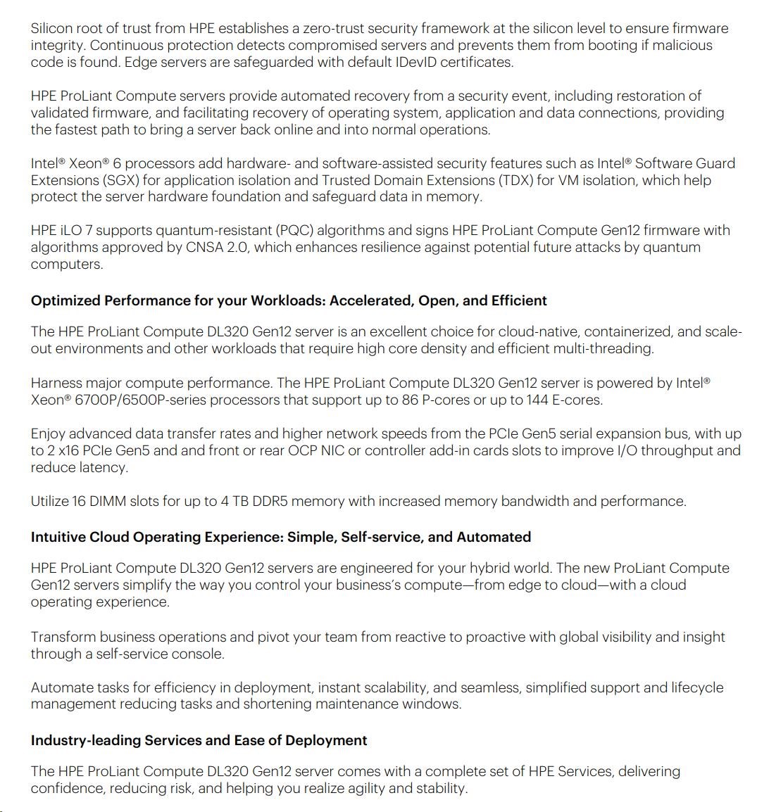 HPE ProLiant Compute DL320 Gen12 servers are engineered for your hybrid world. The new ProLiant Compute Gen12 servers simplify the way you control your business’s compute—from edge to cloud—with a cloud operating experience.