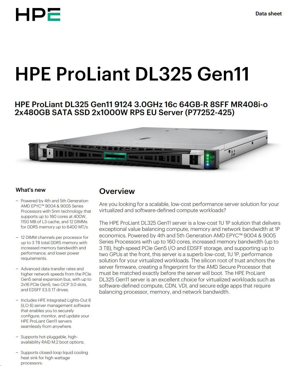 | Model Name | HPE ProLiant DL325 Gen11 9124 3.0GHz 16c 64GB-R 8SFF MR408i-o 2x480GB SATA SSD 2x1000W RPS EU Server |