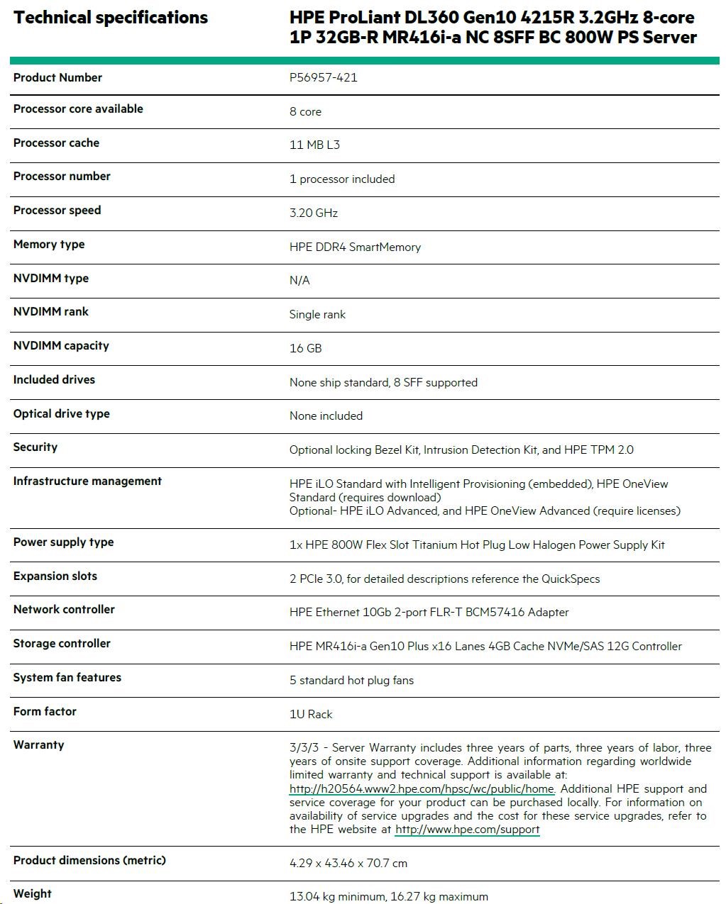 HPE ProLiant DL360 Gen10 4215R 3.20GHz 8-core 1P 32GB-R MR416i-a NC 8SFF BC 800W PS Server