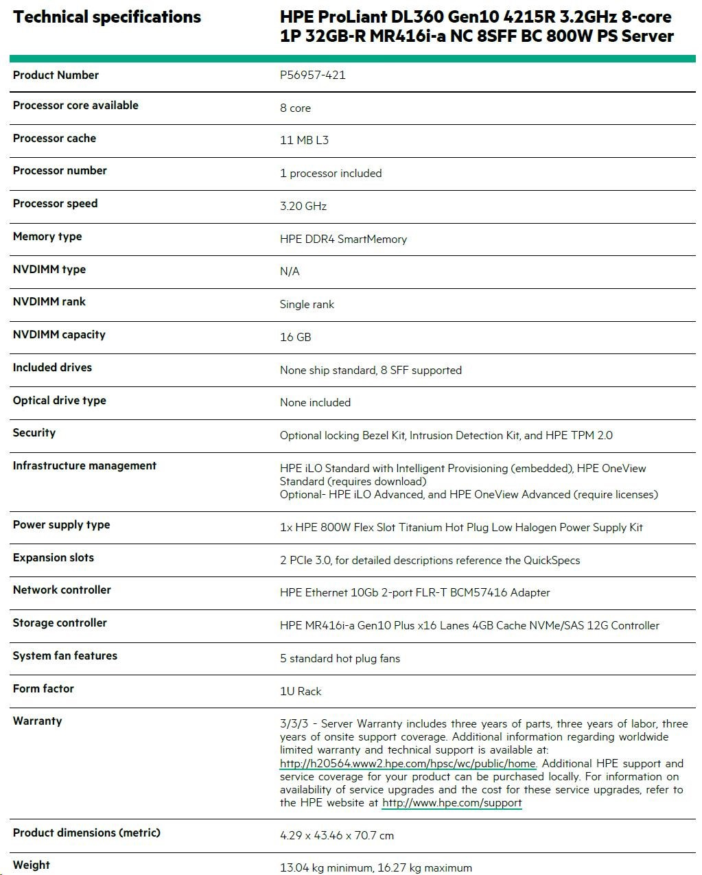 HPE PL DL360g10 4215R (3.2G/8C) 1x32G MR416i 8SFF 1x800W 2x10G-T FLR RENEW