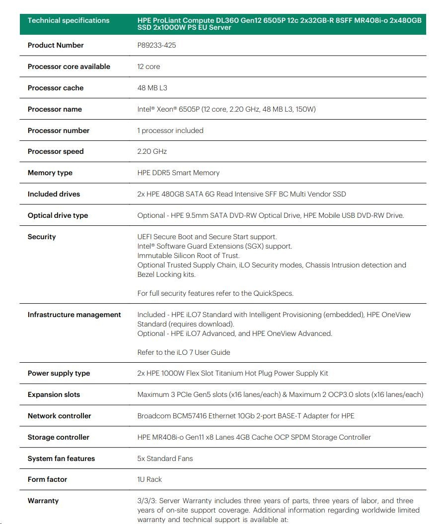 HPE PL DL360g12 6507P (3.5G/8C) 2x32G (P69727) 2x480G MR408i-o 8SFF 2x1000W 10GbE NBD333 Smart Choice