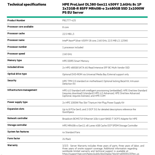 HPE PL DL380g11 4509Y (2.6/8C) 2x32G (p64706) 8SFF MR408i-o 2x480G 2x1000W 4x1Gb NBD333 Smart Choice.