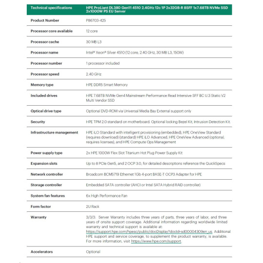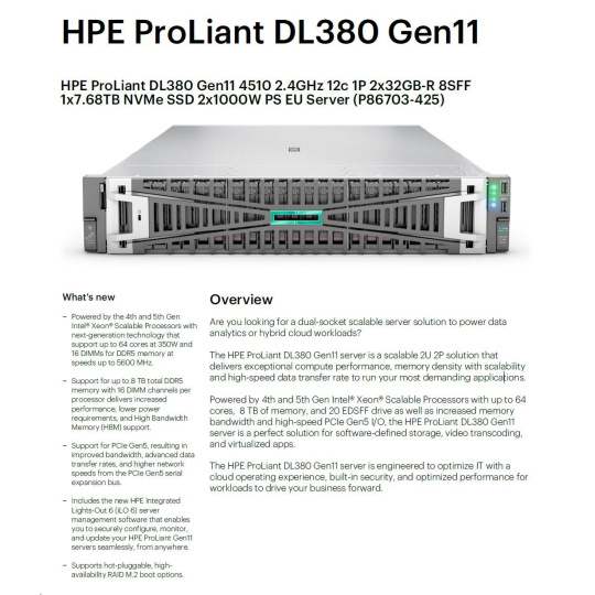 HPE PL DL380g11 4510 (2.4G/12C) 2x32G (p64706) 1x7.68TB NVMe 2x1000W 8SFF 4p1G Smart Choice.