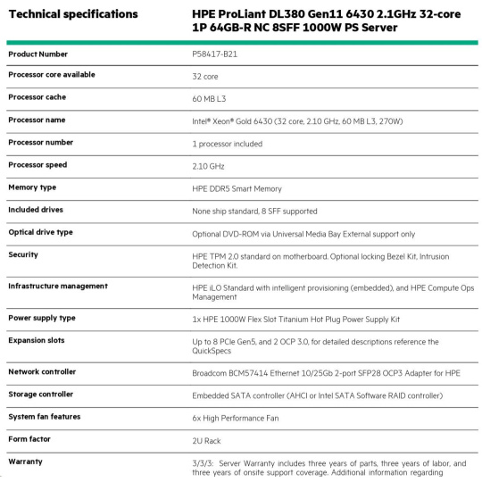 Model Name HPE ProLiant DL380 Gen11 6430 2.1GHz 32-core 1P 32GB-R NC 8SFF 1000W PS Server