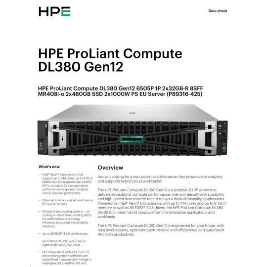 HPE PL DL380 Gen12 6505P (2.2/12C) 2x32G (P69727) 2x480G MR408i-o 8SFF 2x1000W 10GbE NBD333 Smart Choice.