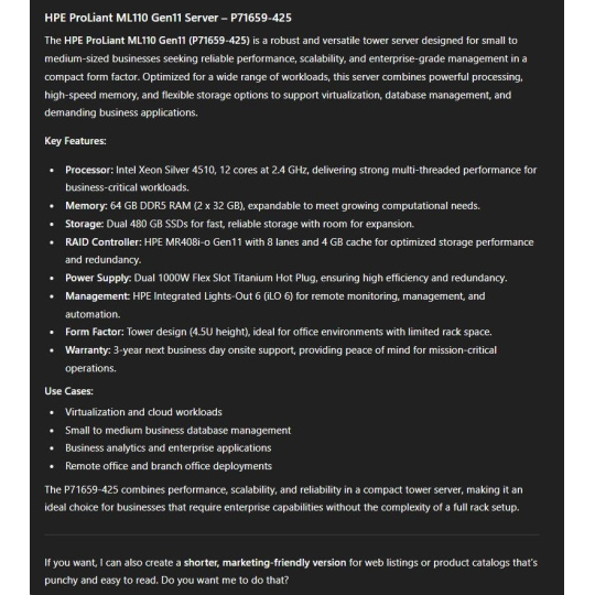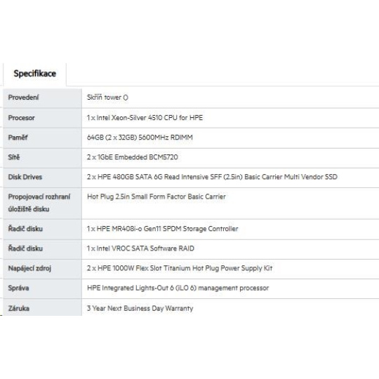 HPE ProLiant ML110 Gen11 4510 12-core 1P 64GB-R MR408i-o 8SFF 2x480GB SSD 2x1000W RPS EU Server