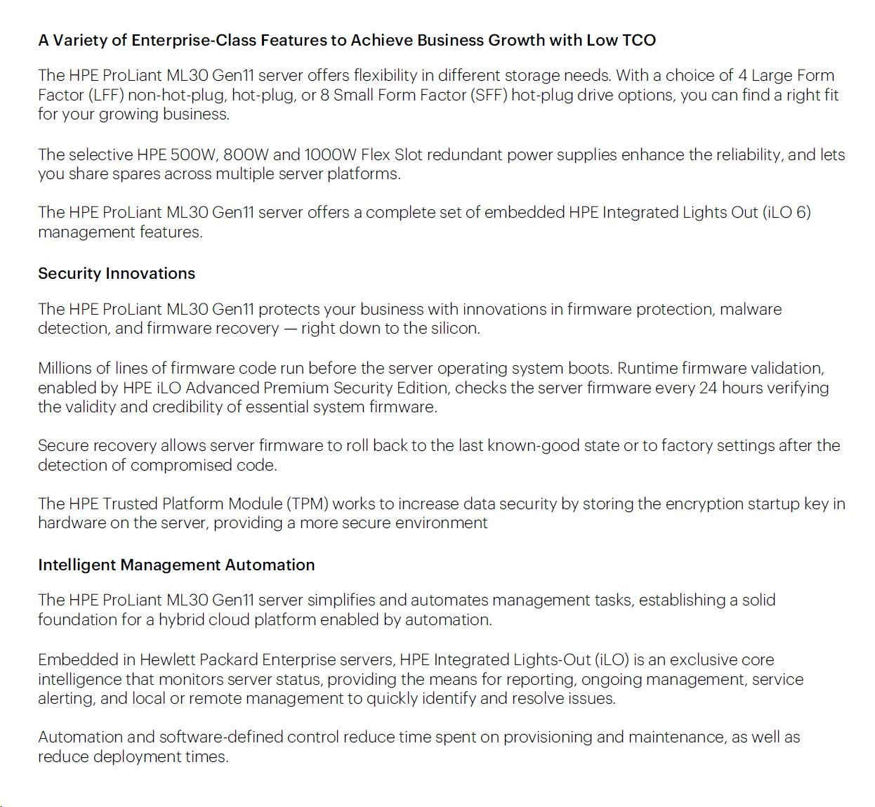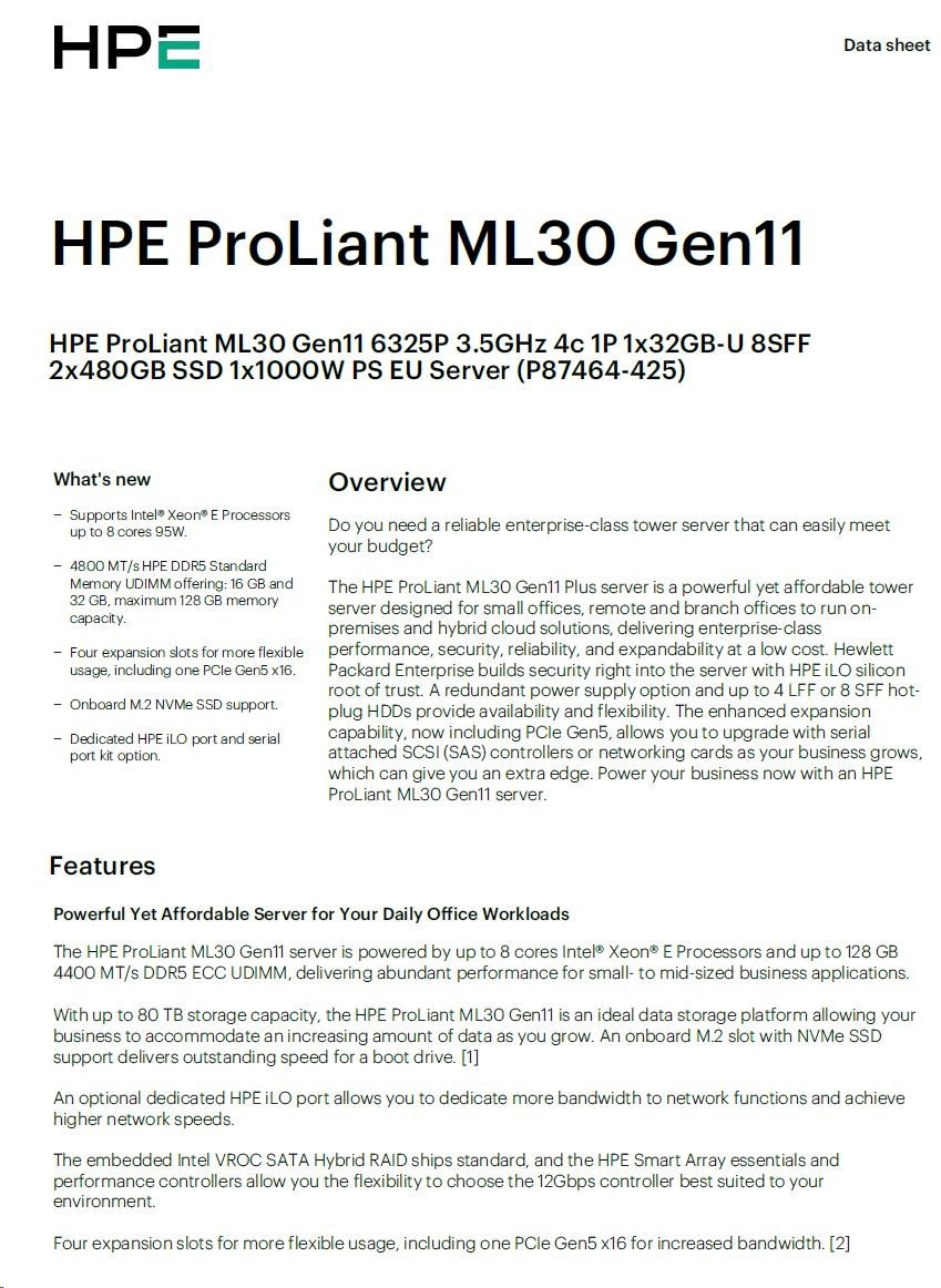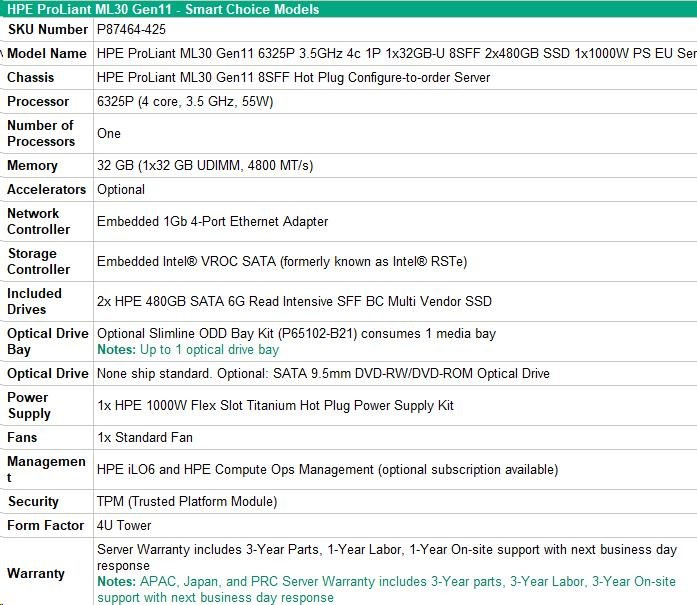 HPE PL ML30g11 6325P (3.5G/4C8T) 1x32G 2x480G SSD 8SFF VROC 1x1000W 4p1G NBD311 Smart Choice.
