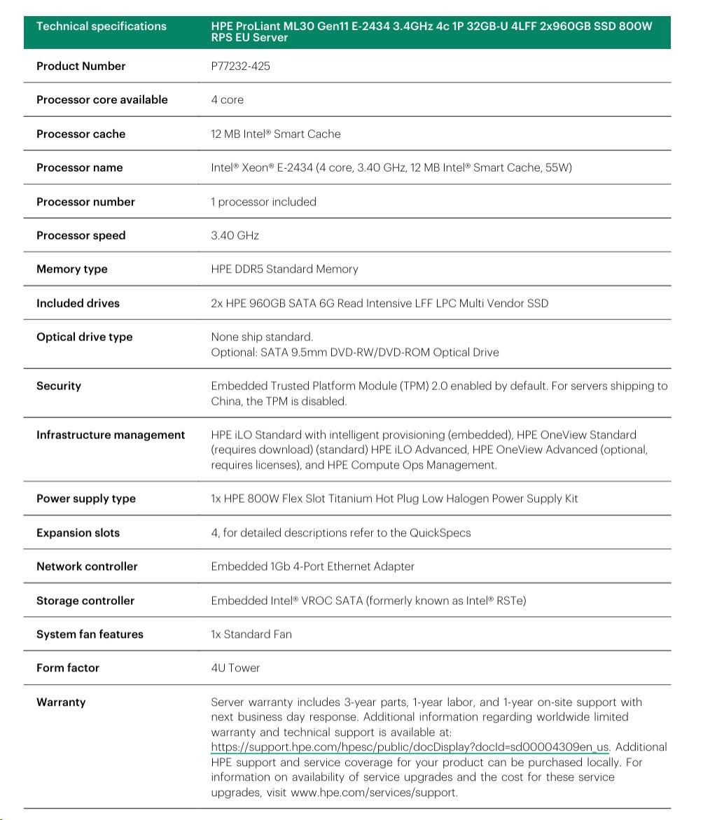| Model Name | HPE ProLiant ML30 Gen11 E-2434 3.4GHz 4c 1P 32GB-U 4LFF 2x960GB SSD 800W RPS EU Server |