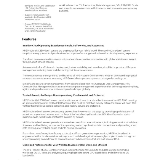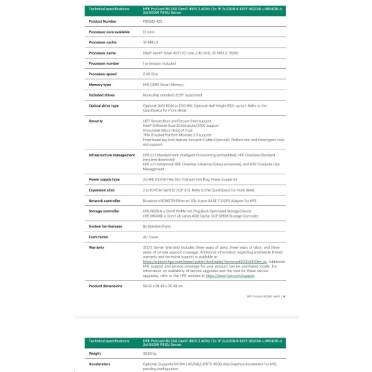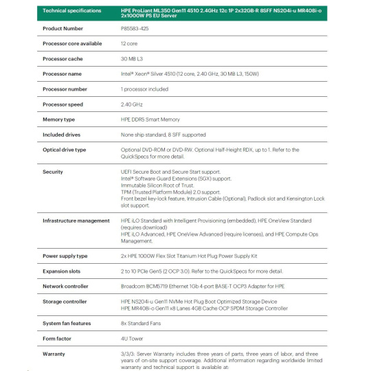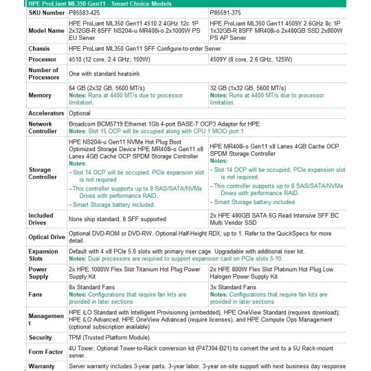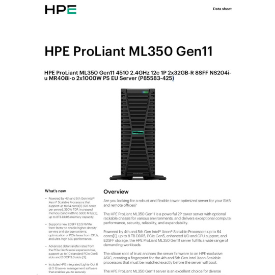 HPE PL ML350g11 4510 (2.4G/12C) 2x32G (P64706) NS204(2x480) MR408i-o 2x1000W 8SFF 4p1Gb 8fans Smart Choice