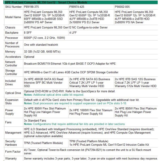 HPE PL ML350g12 6505P (2.2/12C) 1x32G (P69727) 2x4TB 4LFF MR408i-o2x1000W 1GbE NBD333 Smart Choice.