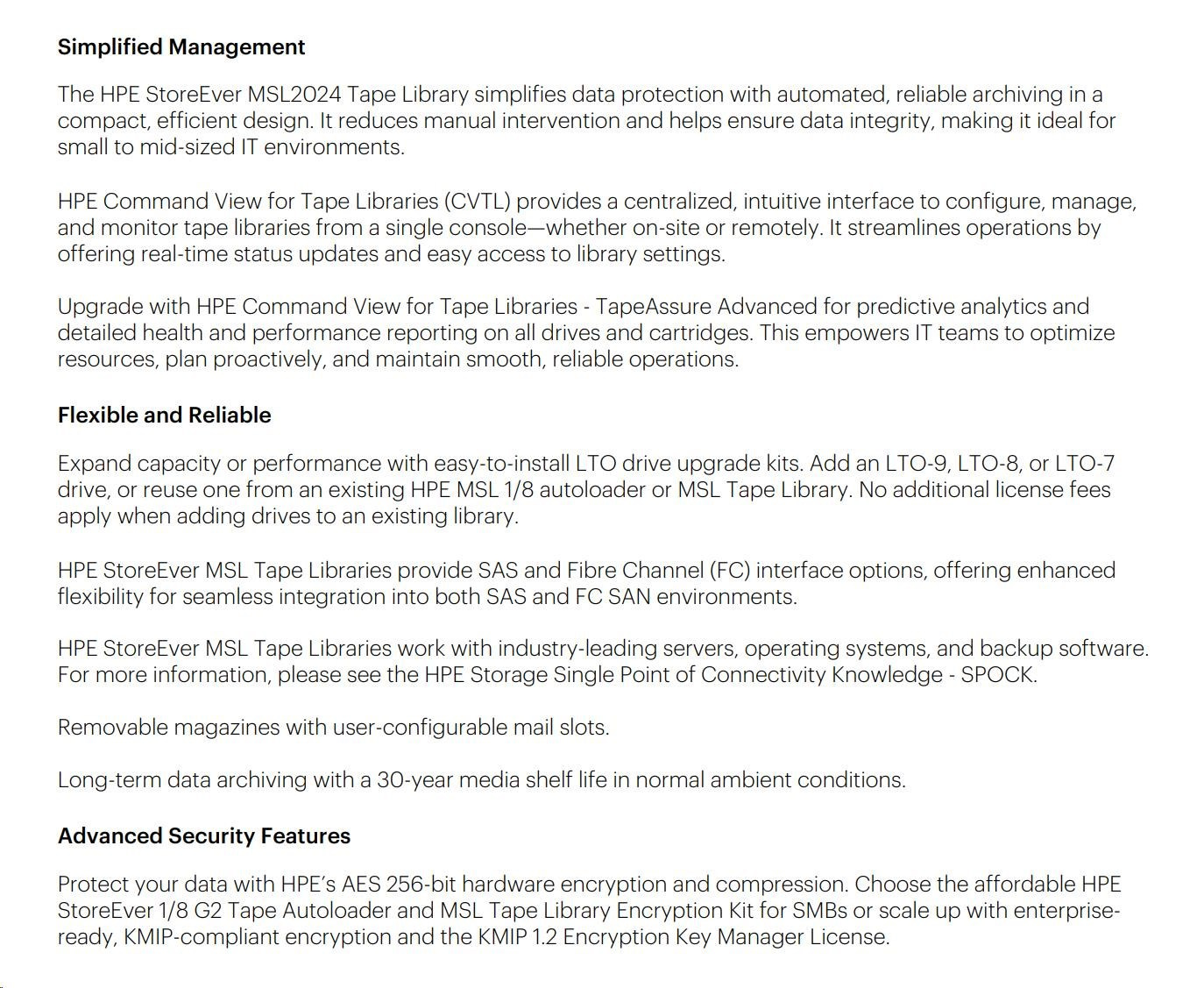 HPE Storage MSL2024 Tape Library 1x MSL LTO-9 Fibre Channel 15x LTO-9 45TB Data Cartridges.