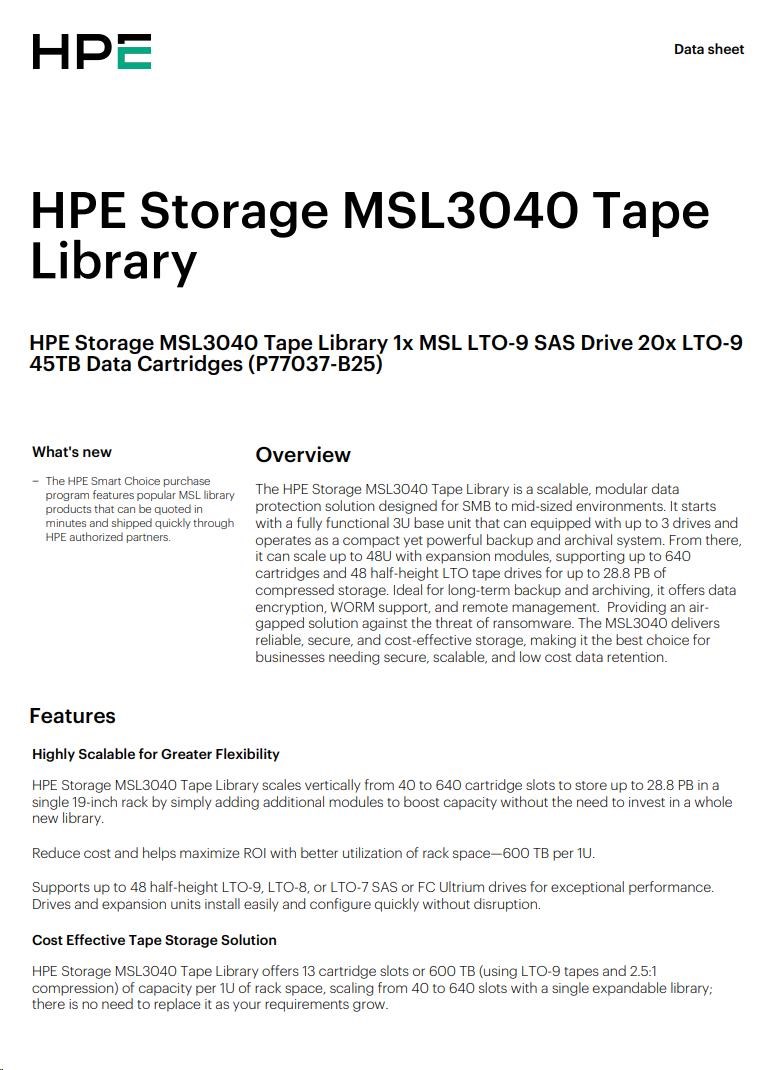 HPE Storage MSL3040 Tape Library 1x MSL LTO-9 SAS Drive 20x LTO-9 45TB Data Cartridges